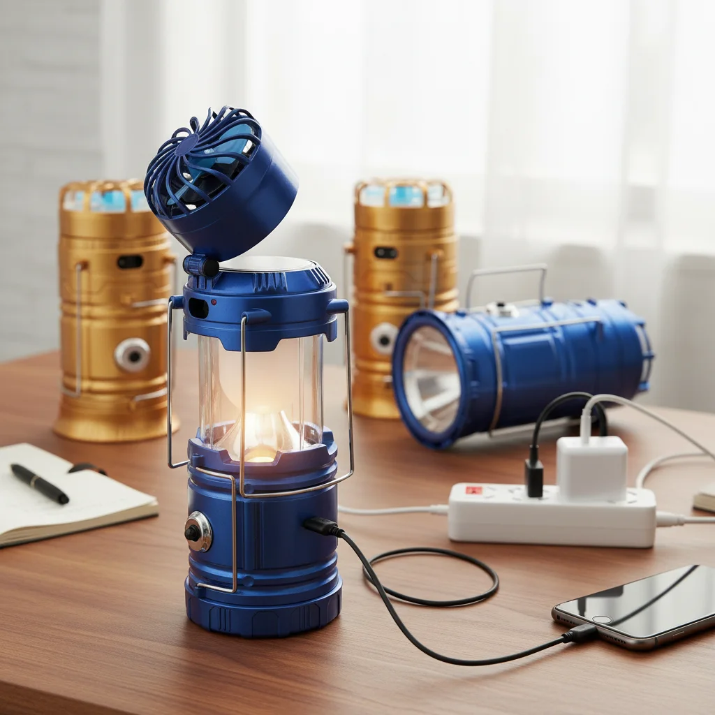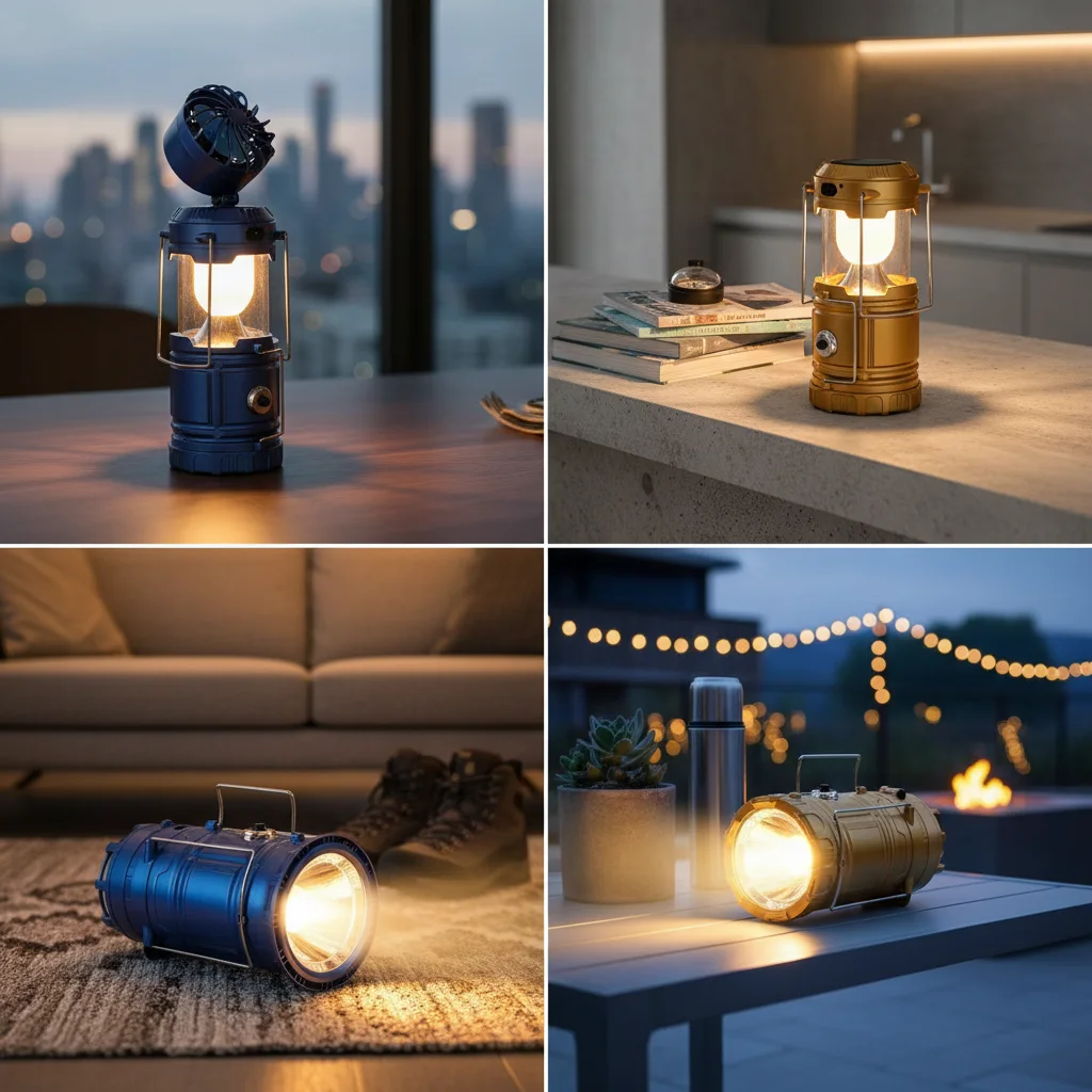 إضاءة خفيفة وهادية لجو السهرات، وإضاءة قوية ترافقك في أصعب الظروف، ومعاها مروحة صغيرة تنعشك في الحرارة العالية.